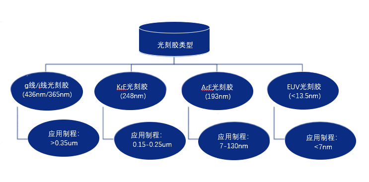 光刻膠是一種對光敏感的混合液體,是微電子技術中微細圖形加工的關鍵材料,其組成部分包括:光引發劑、光刻膠樹脂、單體、溶劑和其他助劑。其按照技術難度、工藝等可以分為g線、i線、KrF、ArF、EUV。