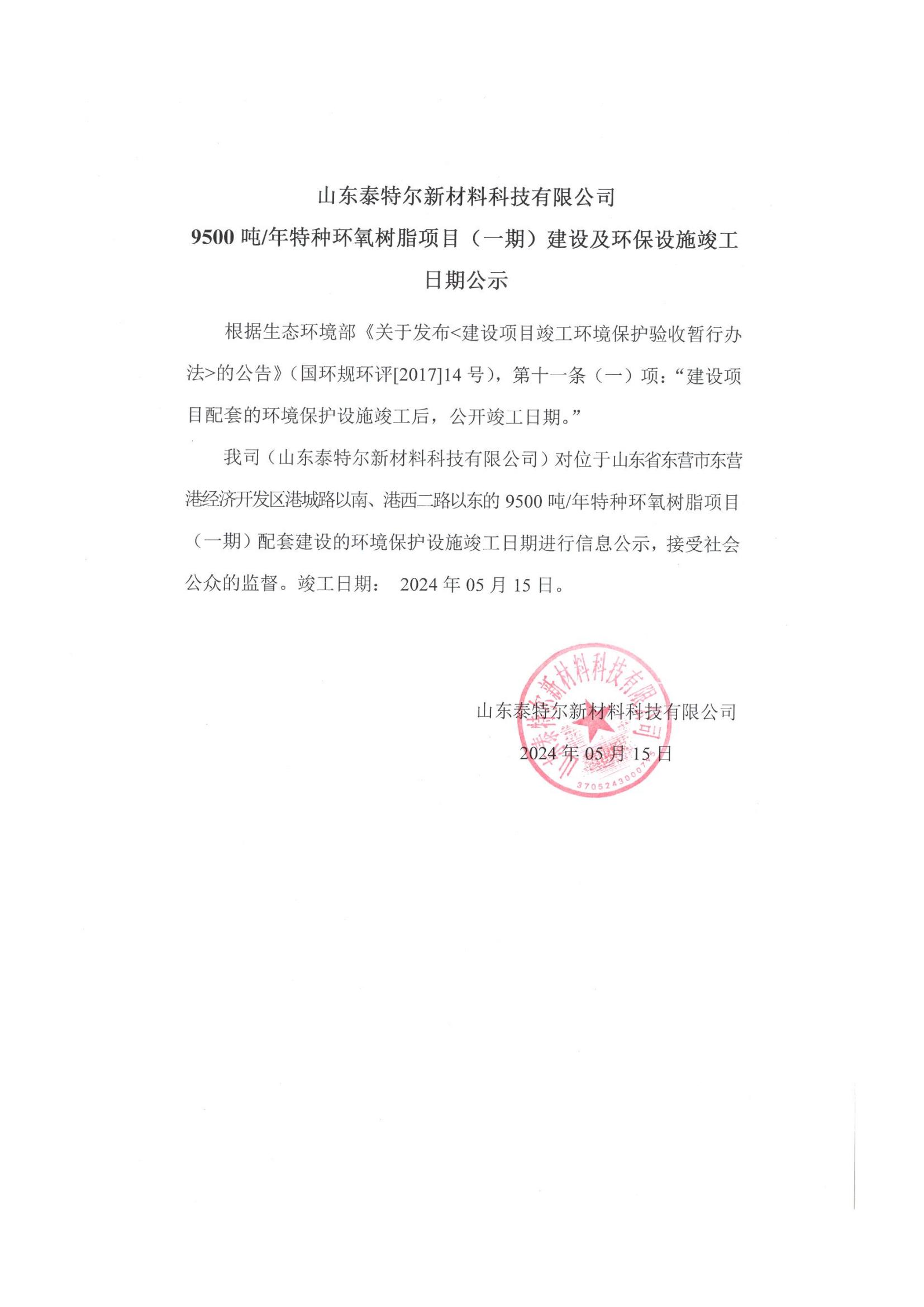 山東泰特爾新材料科技有限公司 9500噸/年特種環氧樹脂項目(一期)建設及環保設施竣工日期公示