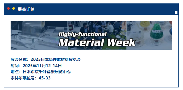 2025年11月12-14日,世界領(lǐng)先的先進(jìn)材料展——東京高性能材料周(Highly-Functional Material Week)即將在日本幕張國(guó)際展覽中心盛大開(kāi)幕。屆時(shí),泰特爾將攜核心產(chǎn)品與創(chuàng)新解決方案精彩亮相,誠(chéng)邀全球客戶(hù)與合作伙伴蒞臨蒞臨45-33號(hào)展位參觀交流。