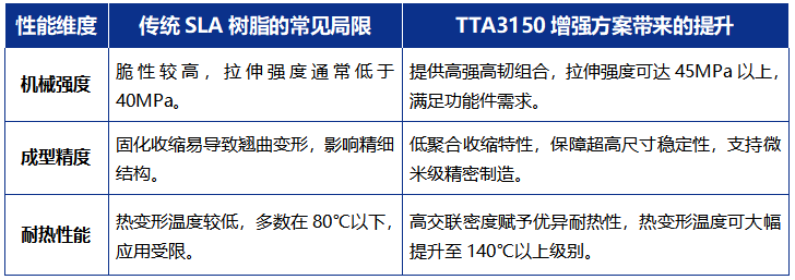 SLA技術(shù)以其無與倫比的打印精度和光滑表面質(zhì)量著稱,是制造精密醫(yī)療器械、微電子元件和復雜功能原型的重要工藝。然而,許多傳統(tǒng)光敏樹脂在固化后存在收縮率大、韌性不足、耐溫性差等短板,限制了其從“樣品展示”邁向“終端使用”的步伐。TTA3150的引入,正有力突破這些瓶頸。