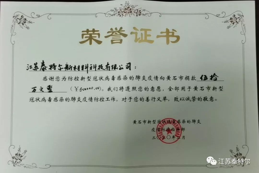 The outbreak of COVID 19, which is spreading rapidly around Wuhan as the center of the epidemic, has spread to all provinces of the country. Facing the sudden outbreak, Jiangsu Tetra New Material Technology Ltd has decided to donate RMB 500 thousand yuan to the Huangshi City Charity Feder...